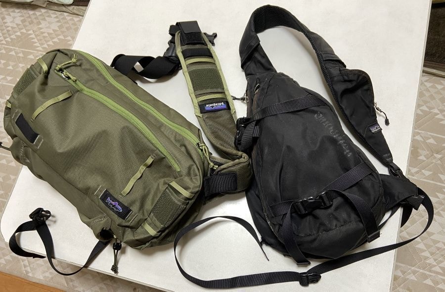右がロゴが霞むまで長年使用したアトム・スリング8L(最近の同製品はフロントポケットが進化していますが、ショルダーベルトの反対側につなげる固定用のウエスト・ストラップがないのが残念でこのオールド・モデルがベストです)