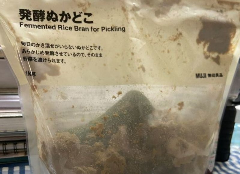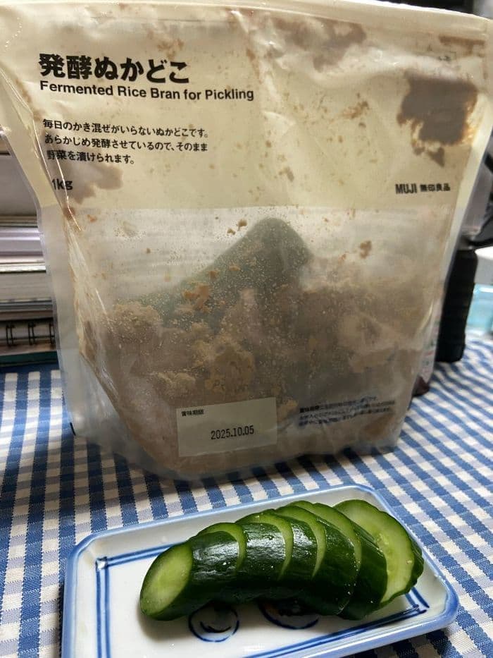 かつては甕やタッパーで糠床をつくり、その管理維持が長続きしなかった原因でしたが、今はすでに仕上がったぬか床のセットが販売(今回は無印良品の「発酵ぬかどこ」を使用、「毎日のかき混ぜがいらないぬかどこです。あらかじめ発酵させているので、そのまま野菜を漬けられます。チャック付袋なので、容器は用意せずにすぐにはじめられます」とあります)されており、価格も決して高いものではありません。